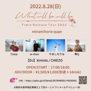 Timieさんのリリースツアー2022に出演します! 8月28日(日)南堀江 qupe OPEN 17:00 / START 18:00 ADV/DOOR ¥2,500/¥3,000 Timie / w-shun / やましたりな / 隼Q 【DJ】kimists / CHIEZO チケット販売URL: <a href="https://eplus.jp/sf/detail/3678040001-P0030001">https://eplus.jp/sf/detail/3678040001-P0030001</a> ※ご予約はDM受付できます <img class="alignnone size-medium wp-image-1752" src="https://yamashitarina.com/wp-content/uploads/2022/07/20220828南堀江qupe-300x300.jpg" alt="" width="300" height="300" />