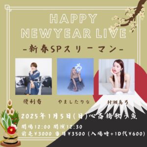 2025年1月5日(日)心斎橋 歌う魚 『HAPPY NEW YEAR LIVE-新春SP3マン-』 act) 優利香 村瀬真弓 やましたりな open 12:00 / start 12:30 adv/day ¥3000(1d別) [配信URL]ツイキャスプレミア¥2500 <a href="https://twitcasting.tv/utausakana0901/shopcart/349188">https://twitcasting.tv/utausakana0901/shopcart/349188</a> ご予約はHP、SNSのリプライ・DMにて <img class="alignnone size-medium wp-image-2592" src="https://yamashitarina.com/wp-content/uploads/2024/12/IMG_4070-300x300.jpeg" alt="" width="300" height="300" />