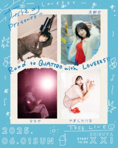 6/1(日) SHIBUYA XXI 『ナガトモユリpresents. Road to QUATTRO with LOVEEES!!』 ▷ 昼公演 🎫 観覧無料 開演12:30 出演 ナガトモユリ / 天野花/ ななせ / やましたりな フリーライブにつきご予約不要 ご来場お待ちしております <img src="https://yamashitarina.com/wp-content/uploads/2025/05/IMG_7229-240x300.jpeg" alt="" width="240" height="300" class="alignnone size-medium wp-image-2853" />