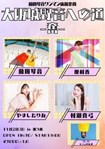 11月2日(日) 『前田琴音ワンマン応援企画 大阪城野音への道-奮-』 act) 前田琴音 優利香 やましたりな 村瀬真弓 (O.A)とっこのんか open/start 18:30/19:00 adv/day ¥3000(1d別) [配信URL] <a href="https://www.youtube.com/channel/UCpxzAZQlmqbRDz1BLDts2Ug">配信はこちらから</a> [投げ銭URL] <a href="https://passmarket.yahoo.co.jp/event/show/detail/02cz4pfyrdp41.html">投げ銭はこちらから</a> <img class="alignnone size-medium wp-image-3043" src="https://yamashitarina.com/wp-content/uploads/2025/09/IMG_0669-212x300.jpeg" alt="" width="212" height="300" />