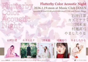 1月19日(月) 心斎橋JANUS 「Flutterby Color Acoustic Night」 open 18:30 / start 19:00 前売¥2800 / 当日¥3300 (別途1ドリンク代) 出演 : 石坪日菜 カズミナナ 三国未来 村瀬真弓 やましたりな ご予約はSNSのリプ、DMまたは 手売りチケット(物販にて要問い合わせ) <img src="https://yamashitarina.com/wp-content/uploads/2025/12/IMG_3002-300x212.jpeg" alt="" width="300" height="212" class="alignnone size-medium wp-image-3105" />