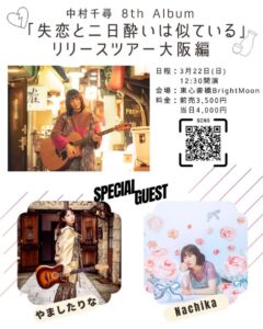 3月22日(日) 中村千尋 8th Album 「失恋と二日酔いは似ている」 リリースツアー〜大阪編〜 OPEN 12:00 / START 12:30 東心斎橋 Bright Moon [ 住所 ] 大阪市中央区東心斎橋1-12-14 ZELKOVAビル6階 🎫前売3,500円/当日4,000円 (+1ドリンク) [ 出演 ] 中村千尋 / やましたりな/Nachika <a href="https://docs.google.com/forms/d/e/1FAIpQLSdd_8uN82QUMBbZ7gd7ieYDyyGDqiVnKiI-A-59K7ZFnZ6NYg/viewform?usp=sharing&ouid=103686608411127332967%EF%BC%89%E3%81%AE%E3%83%81%E3%82%B1%E3%83%83%E3%83%88%E4%BA%88%E7%B4%84%E3%83%95%E3%82%A9%E3%83%BC%E3%83%A0%E3%82%88%E3%82%8A%E3%81%94%E4%BA%88%E7%B4%84%E3%81%8A%E5%BE%85%E3%81%A1%E3%81%97%E3%81%A6%E3%81%8A%E3%82%8A%E3%81%BE%E3%81%99%EF%BC%81">ご予約はこちら(お目当ての記入もお忘れなく)</a> <img src="https://yamashitarina.com/wp-content/uploads/2026/02/IMG_4669-240x300.jpeg" alt="" width="240" height="300" class="alignnone size-medium wp-image-3141" />